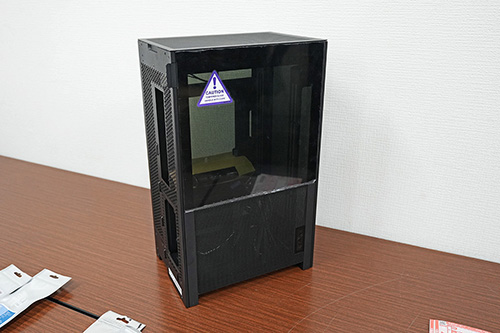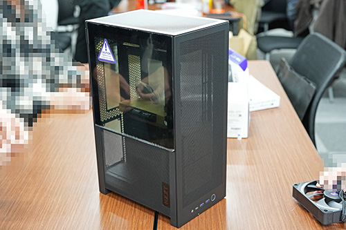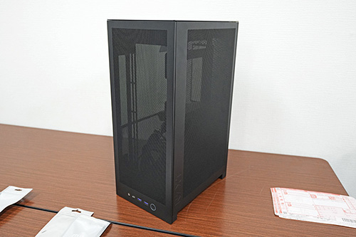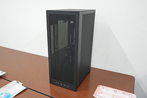 本体サイズは幅181×奥行き263×高さ435mmで、SFX電源が搭載可能なほか、280mmラジエーターの水冷CPUクーラーも搭載可能。ビデオカードは長さ331mm/3スロット占有までのサイズのものに対応しています。ケースのパネルは大部分がメッシュ仕様で、左側面側にガラスパネルを採用。ツールレスデザインを採用するなど、扱いやすさにもこだわったケースになっています。カラーは今のところブラックモデルのみとのことでした。
