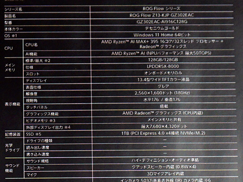 ROG Flow Z13-KJPは、Ryzen AI MAX+ 395(16コア/32スレッド)や128GBのメモリ(LPDDR5-8000)を搭載した13.4インチサイズの2in1ゲーミングノートPC。キーボードの違いで日本語配列モデルと英語配列モデルの2種類が用意されている。