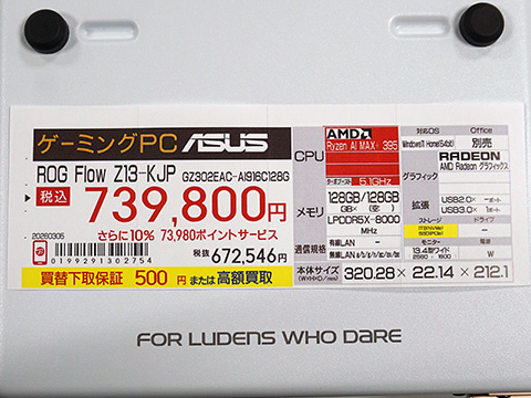 店頭価格は739,800円(10%ポイント還元サービス付き)で、ソフマップAKIBA パソコン・デジタル館では実機展示が行われている。