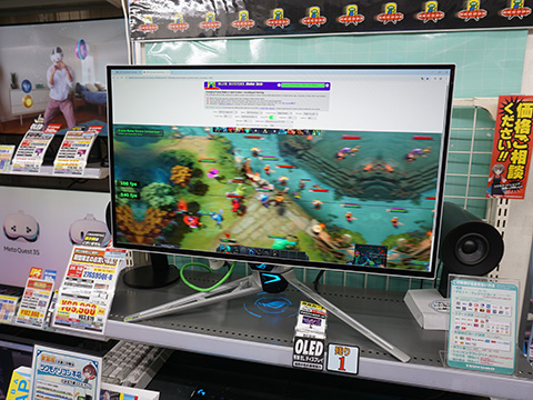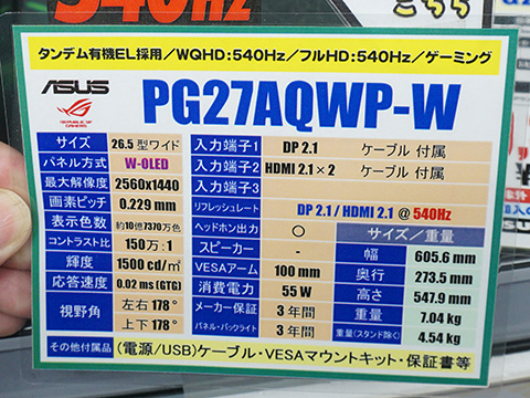 ROG史上最速級リフレッシュレートとうたわれたタンデムOLED技術搭載26.5インチゲーミングモニター「ROG Swift OLED PG27AQWP-W」が、ツクモパソコン本店IIで展示中。