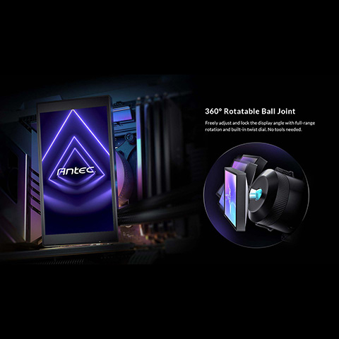 Antec Vortex View 360はポンプやラジエーターが一体となったオールインワンタイプの水冷CPUクーラー。5インチIPSディスプレイ(解像度1,280×720)を搭載しており、ディスプレイは360°回転可能なほか、ディスプレイ裏にRGB LEDを備える。