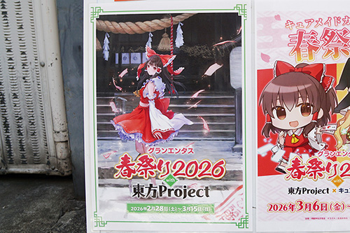 オノデン1階のグランエンタスでは、「グランエンタス春祭り2026 with 東方Project」が開催されていました。4階のキュアメイドカフェでイベント連動のコラボカフェも開催しています。期間は3月15日(日)まで。
