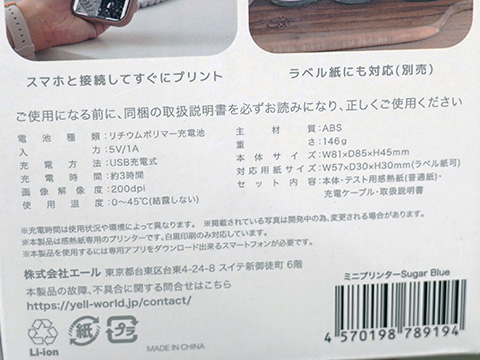本体サイズはW81×D85×H45mm、重量は146g。充電時間は3時間。解像度は200dpi。印刷には専用アプリのダウンロードが必要。