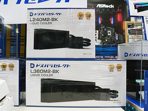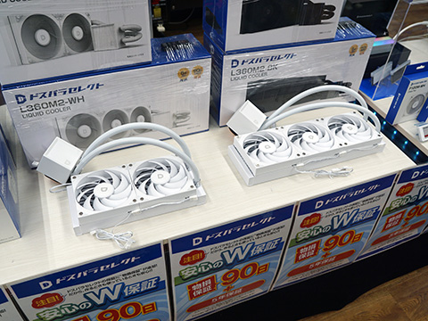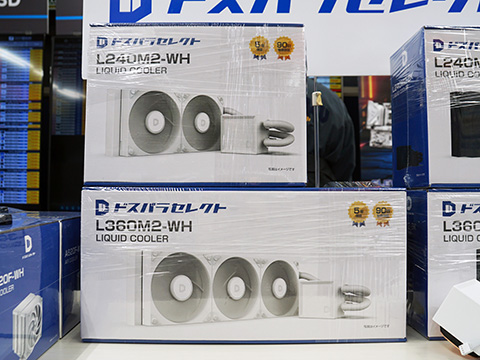 価格はL240M2が8,480円、L360M2が9,980円。ドスパラ秋葉原本店ではL240M2とL360M2のホワイトモデルが展示されている。