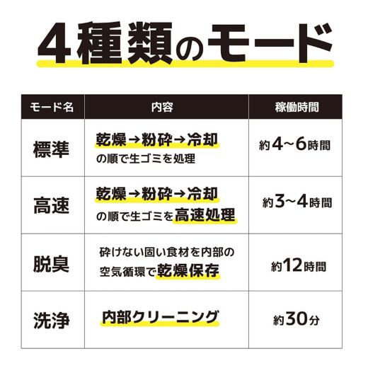 動作モードは標準/高速/脱臭/洗浄の4種。処理に必要な稼働時間目安は3~12時間。活性炭フィルターを内蔵し、臭いを吸収してくれる点も特徴。