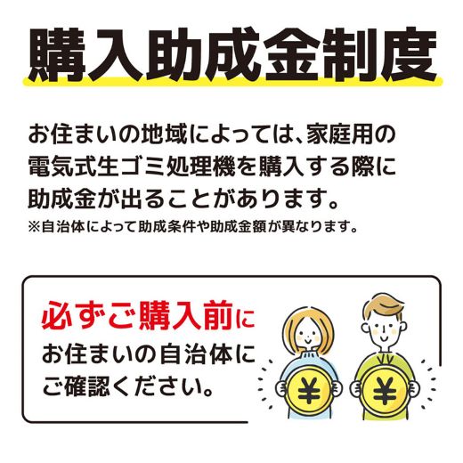 また、自治体によって用意されている家庭用の生ゴミ処理機の助成金対象となる場合もあるため、購入前に確認するよう推奨されている。