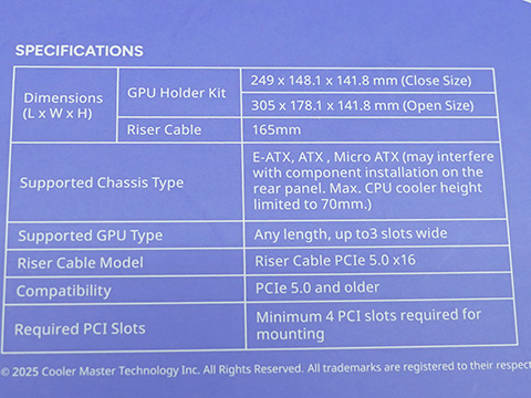 E-ATX・ATX・microATXケースに対応し、最大3スロット幅のビデオカードをサポートする(取り付けには最低4つのPCIスロットが必要)。展開時の本体サイズは305×178.1×141.8mm。