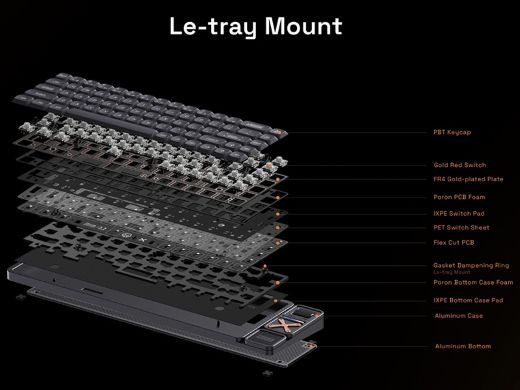 独自の「Le-Trayマウント構造」を採用し、PCBに配置された4つのサポートアームとシリコンリングで柔らかく心地よい打鍵感を実現。ロープロファイルキーボードながらしっかりとしたクッション性と安定した打鍵感を両立しているとする。