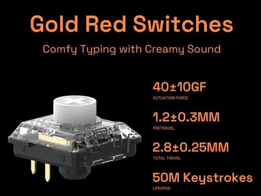 キースイッチにはリニアストロークのGold Redスイッチを採用する。アクチュエーションポイントは1.2±0.3mm、総トラベルは2.8±0.25mmで、アクチュエーション荷重は40±10gf。