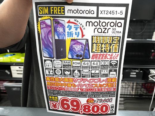 モトローラの折りたたみスマートフォン「razr 50 Ultra(型番 XT2451-5)」の未使用品が、イオシス各店でセール中。