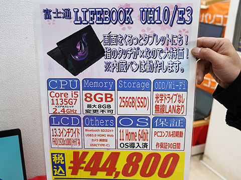 Core i5-1135G7(4コア/8スレッド)搭載の13.3インチノートPC「LIFEBOOK UH10/E3」の中古品が、PCコンフル 秋葉原2号店でセール中。