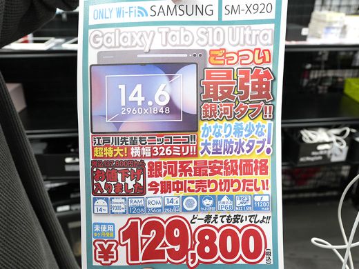 Samsung製14.6インチタブレット「Galaxy Tab S10 Ultra(SM-X920)」の未使用品が、イオシス各店でセール中。店頭価格は129,800円。保証期間は6か月。