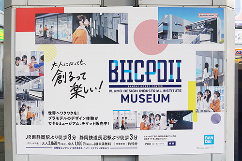 JR秋葉原駅の昭和通り口を出た先の柱に、バンダイナムコのミュージアム「BHCPDII MUSEUM」の広告が掲載されていました。「BHCPDII MUSEUM」は、静岡県にあるBANDAI SPIRITSの工場内ミュージアムで、プラモデルの製造を体験できる施設です。