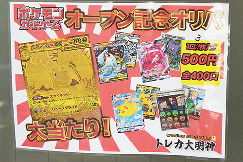 昌平橋通りから1本入った明神下中通りに「トレカ大明神」がオープン。ポケモンカードを主に取り扱うカードショップで、取材時にはオープン記念のショップオリジナルパックが販売されていました。