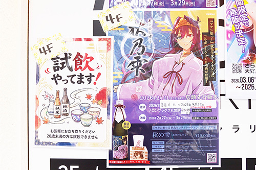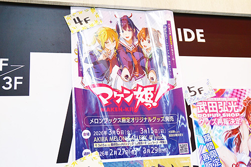 TOKYO OTAKU SHOPの4階では、3月15日までの期間限定で「マケン姫っ!」コラボ日本酒「秋の雫」の店頭先行販売が行われていました。また、「マケン姫っ!」関連のメロンブックス限定オリジナルグッズも販売していました。