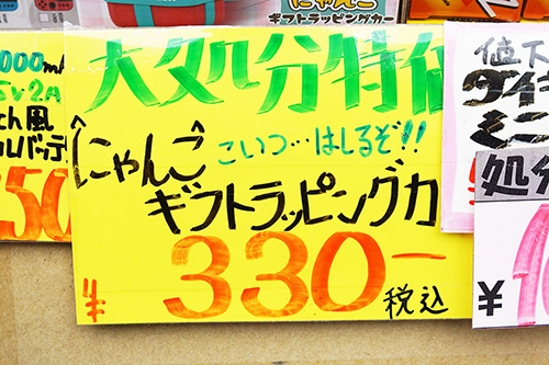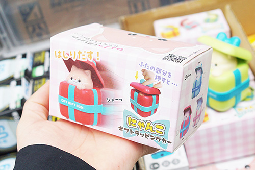 あきばお~弐號店では、「にゃんこギフトラッピングカー」が処分特価の330円で販売されていました。蓋を押し込むと走るゼンマイ式の可愛らしいおもちゃです。