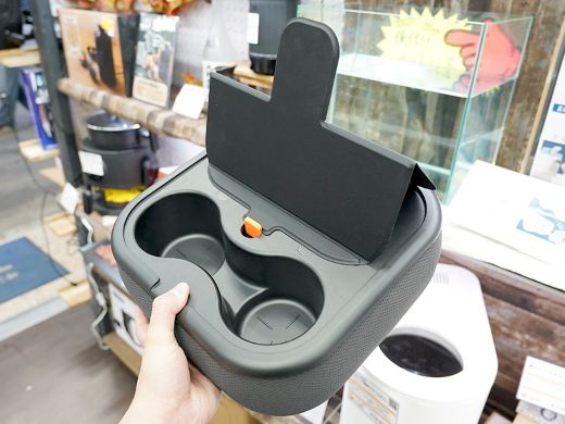 ドリンクホルダーはペットボトルなどを2本設置できるデザインで、ペンなどを収納できる小物入れも備える。