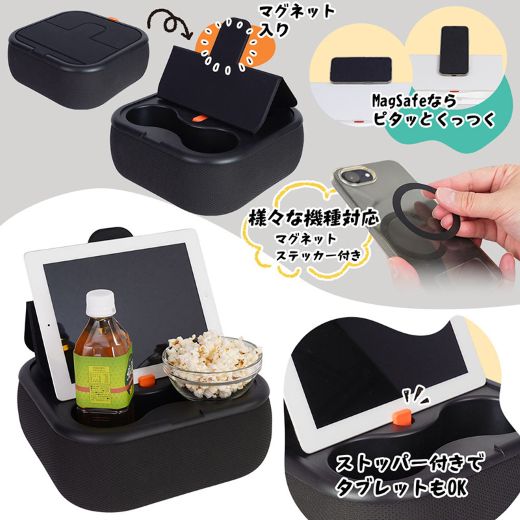 簡易テーブル機能として使える膝上クッションで、スマートフォン/タブレットスタンドとドリンクホルダーを備えた製品。サンコーでは「ソファでの“だらだら”に快適さをプラスする」などとしている。