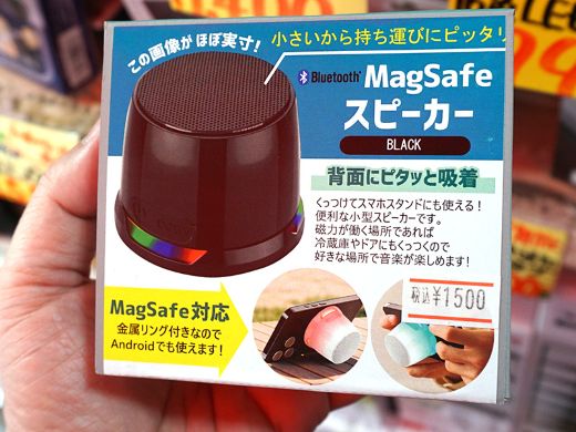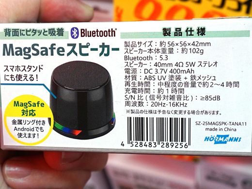 スマートフォンの背面に固定できる「MagSafeスピーカー」があきばお~弐號店に入荷。店頭価格は1,500円。