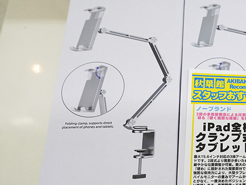 ノーブランド扱いのクランプ固定式タブレットスタンドアームで、厚みのあるパイプ構造により高い安定性と耐久性を実現しているほか、3段式のロングアームにより細かい位置調整が行えるという。