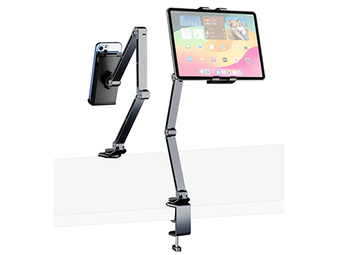 アルミ合金製のアーム型タブレットスタンドにグレーカラーモデル、iPadやスマホなどに対応