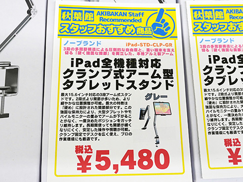 アルミ合金製のタブレットスタンド「iPad全機種対応 クランプ式アーム型タブレットスタンド グレー(iPad-STD-CLP-GR)」が、秋葉館に入荷。