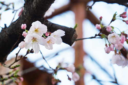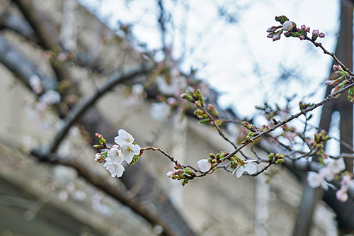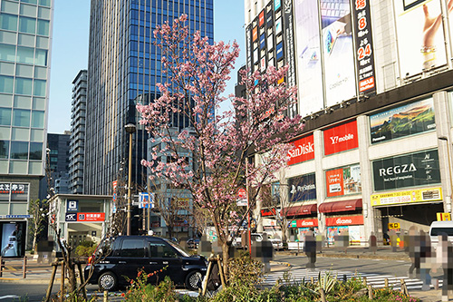 取材日の秋葉原では、桜が各所で開花。例年よりも少し早めの開花となり、予報では3月末日ごろが満開となっています。