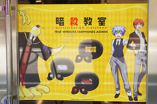 音アニ2号店では、「暗殺教室」のコラボワイヤレスイヤホンの店頭展示・受注販売が行われていました。ONKYOのワイヤレスイヤホン「ANIMA AOW04」とコラボレーションしたモデルとなっています。