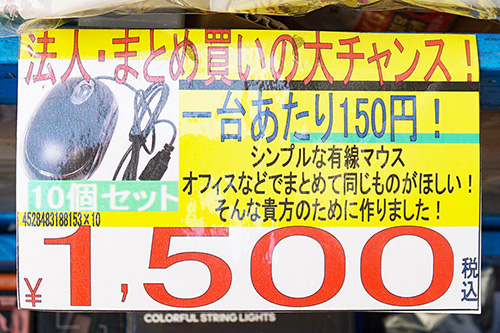 あきばお~零では、USB有線マウスが10台まとめて1,500円で販売されていました。「法人・まとめ買いの大チャンス!」との事で、予備マウスのストックとしてもいいかもしれませんね。