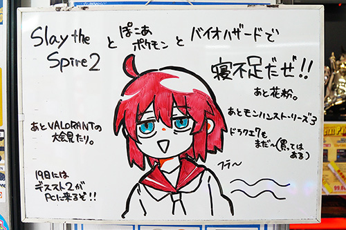 取材中に見かけたホワイトボード・黒板アートをご紹介。パソコンショップアークでは、最近発売されたゲーム(と花粉)で寝不足なアク子が描かれていました。美容室 秋葉原 OFF-KAi!!の店頭黒板が久々に更新、「超かぐや姫!」のイラストに。fandom Akibaでは、eスポーツイベント「VSPO! SHOWDOWN 2026 powered by RAGE」を応援するイラストが描かれていました。