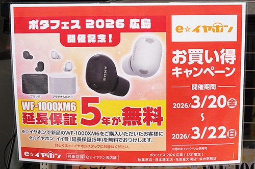 eイヤホン秋葉原店本館では、「ポタフェス 2026 広島」の開催を記念した連動キャンペーンを実施。3月20~22日限定で、SONYのワイヤレスイヤホン「WF-1000XM6」の延長保証が無料となっていました。