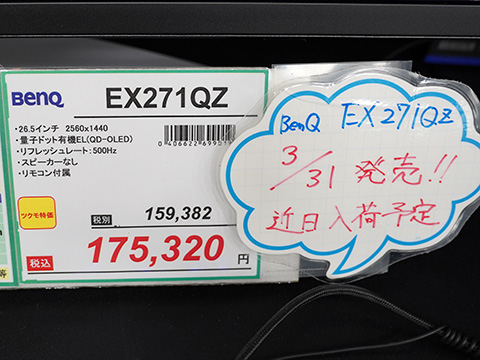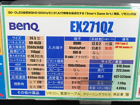 量子ドット+有機EL採用の500Hz/WQHD/26.5型ゲーミングモニター「EX271QZ」が発売