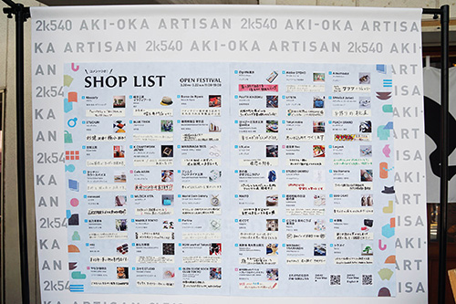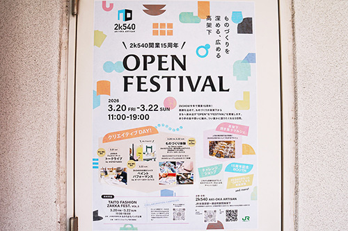 高架下の2k540では、15周年記念イベント「OPEN FESTIVAL」が開催。ワークショップや焼き菓子マルシェを実施していました。また、2k540内で現在営業を行っているショップリストをコメント付きで紹介していました。