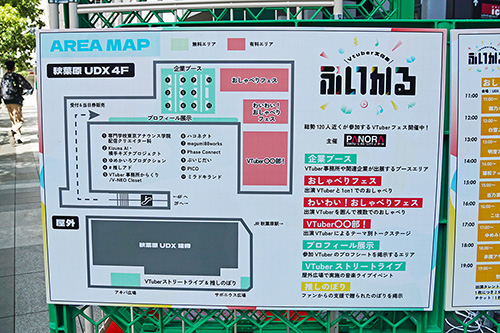 秋葉原UDXでは、総勢120名のVTuberが参加した「ぶいかる」が開催。屋内では、VTuberとの対話が楽しめるコーナー展開されていたほか、VTuber事務所がブースを出展。屋外では、ファンの支援による"推しのぼり"の設置や、ストリートライブが開催されていました。ストリートライブ会場の前ではファンがサイリウムを振りながら応援を行っていて、溢れる熱気を感じられました。