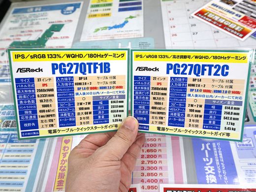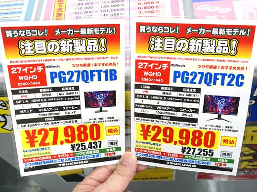 PG27QFT2CとPG27QFT1Bは、WQHD(2,560×1,440)解像度のIPSパネルを採用した27インチゲーミングモニター。店頭価格は順に29,980円、27,980円。