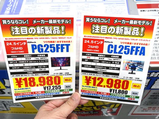 PG25FFTとCL25FFAは、フルHD解像度のIPSパネルを採用した24.5インチゲーミングモニター。店頭価格は順に18,980円、12,980円。