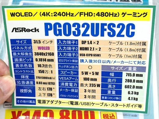 PGO32UFS2Cは、4K(3,840×2,160)解像度のWOLEDパネルを採用した31.5インチゲーミングモニター。店頭価格は149,800円。