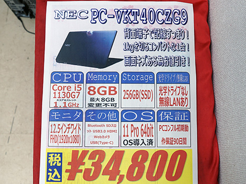 Core i5-1130G7(4コア/8スレッド)搭載のNEC製12.5インチノート「PC-VKT40CZG9」の中古品が、PCコンフル 秋葉原2号店でセール中。