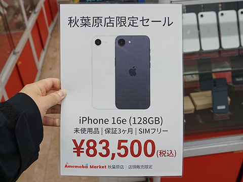 Appleの6.1インチスマートフォン「iPhone 16e」の未使用品が、アメモバマーケット東京秋葉原店でセール中。