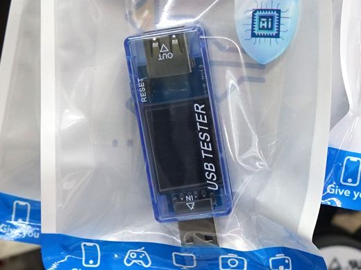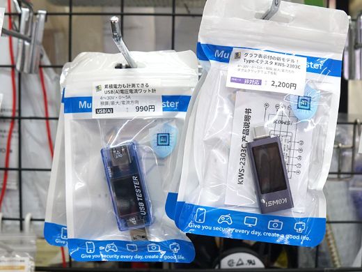 「USB(A)電圧電流ワット計」は、累積電力も測定できるというUSB Type-A接続の簡易チェッカー。店頭価格は990円。