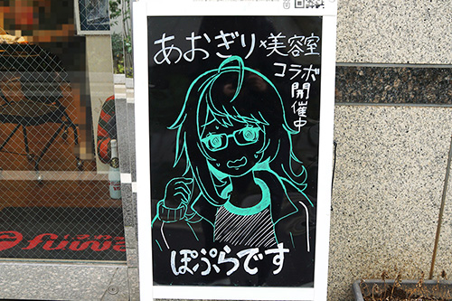 美容院fuwatの店頭黒板が更新、5月29日(金)まで実施中のVTuberグループ「あおぎり高校」とのコラボキャンペーンをアピールするものになっていました。