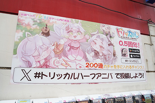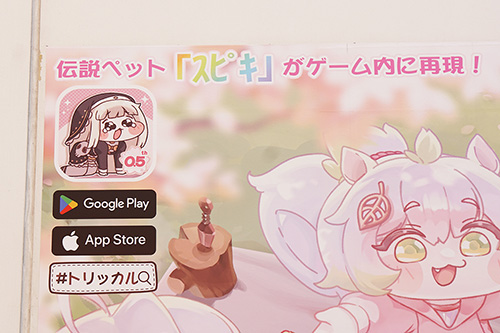 ビックカメラAKIBAやドン・キホーテ 秋葉原店に、スマホ向けゲーム「トリッカル・もちもちほっペ大作戦」の広告が掲載されていました。イラストには、SNS上などで人気の「スピキ」の姿も描かれています。