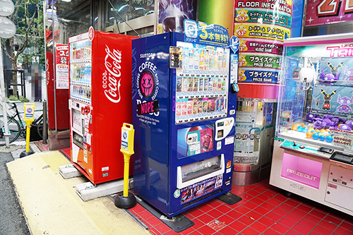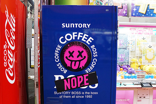 東京レジャーランド 秋葉原店前の自販機が「NOPE(ノープ)ギルティ炭酸」にジャックされていました。サントリーの自販機はBOSSコーヒーがトレードマークですが、その上の大きく“NOPE”のステッカーが貼られています。