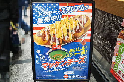 築地銀だこ ヨドバシAKIBA店では、期間限定のドジャースコラボメニュー「LAマッケンチーズ」たこ焼きが販売。発売記念として、3月29日までの限定で100円引きになるキャンペーンが開催されていました。