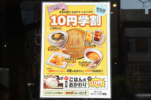焼肉ライク 秋葉原中央通り店では、中学生以上の学生を対象とした「10円学割」キャンペーンが開催されていました。4種のトッピングの中から1品が10円で追加できたり、17時以降は10円でごはんのおかわりができたりします。なお、キャンペーンの適用には"学生証"の提示が必須とのこと。