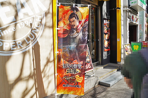 ペッパーランチ 秋葉原中央通り店では、「信長の野望 出陣」コラボメニューが販売されていました。"天下"と"天かす"をかけたユニークなネーミングのメニューの販売や、コラボメニューの注文で「オリジナル武将カード」がもらえます。販売期間は5月6日(水)まで。