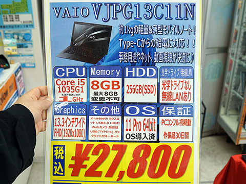 13.3型「VAIO」が27,800円!Core i5-1035G1やWindows 11 Pro搭載モデルの中古PCセール