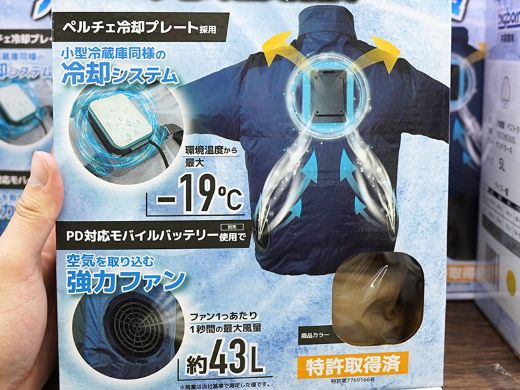 2025年発売の「冷蔵服4」の後継モデルで、最大風量43L/sのファンで外気を取り込み、ペルチェプレートで背中を冷やすことで、外気温に左右されず「ひんやり」を感じられるとしている。