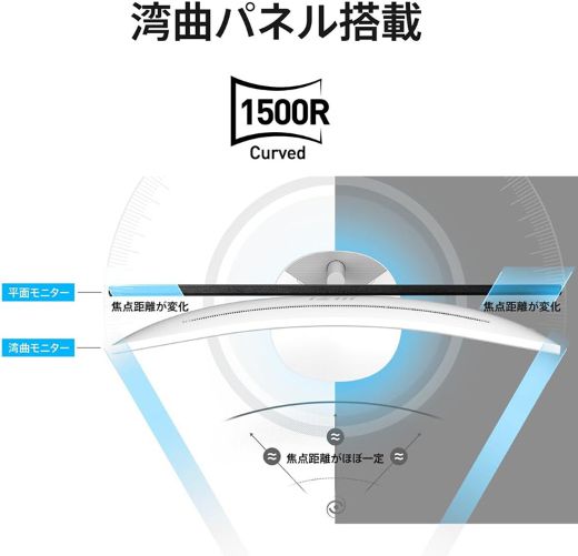主な特長として1,500Rの湾曲パネルによる自然な視認性を挙げている。人間の目のカーブに近い1,500Rの曲率を採用し、視線移動が少なく、画面端の情報が見やすいとしている。