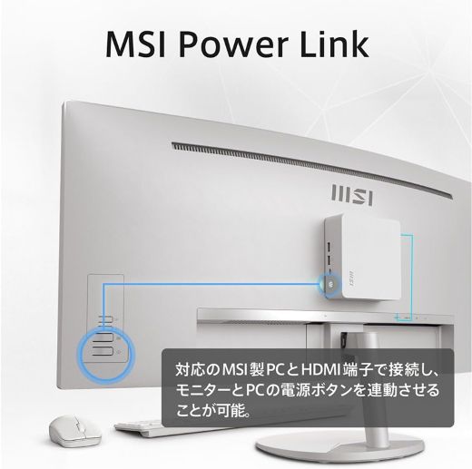 VESA対応&MSI Power Linkも特長。モニターアームへの取り付けなどが可能で、また、MSI Cubiシリーズ等との接続でモニターとPCの電源連動機能が使用できる。